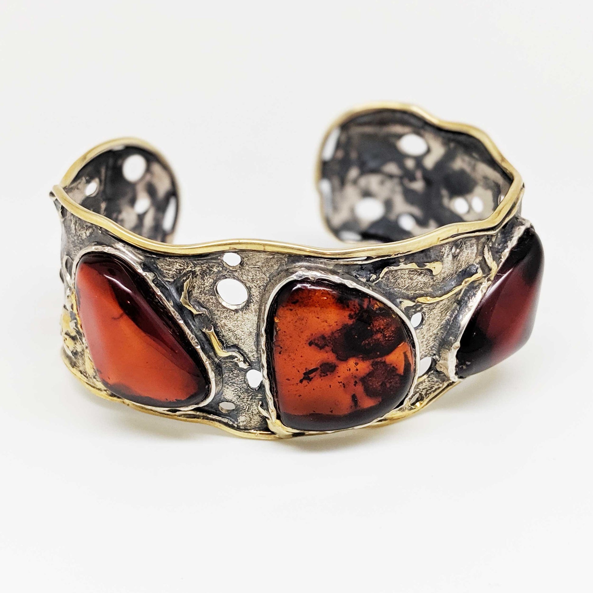 Cherry color Baltic Amber is used in this cuff. The metal used in this cuff is Sterling silver which is gold plated to give it an extra richness. The cuff is adjustable.