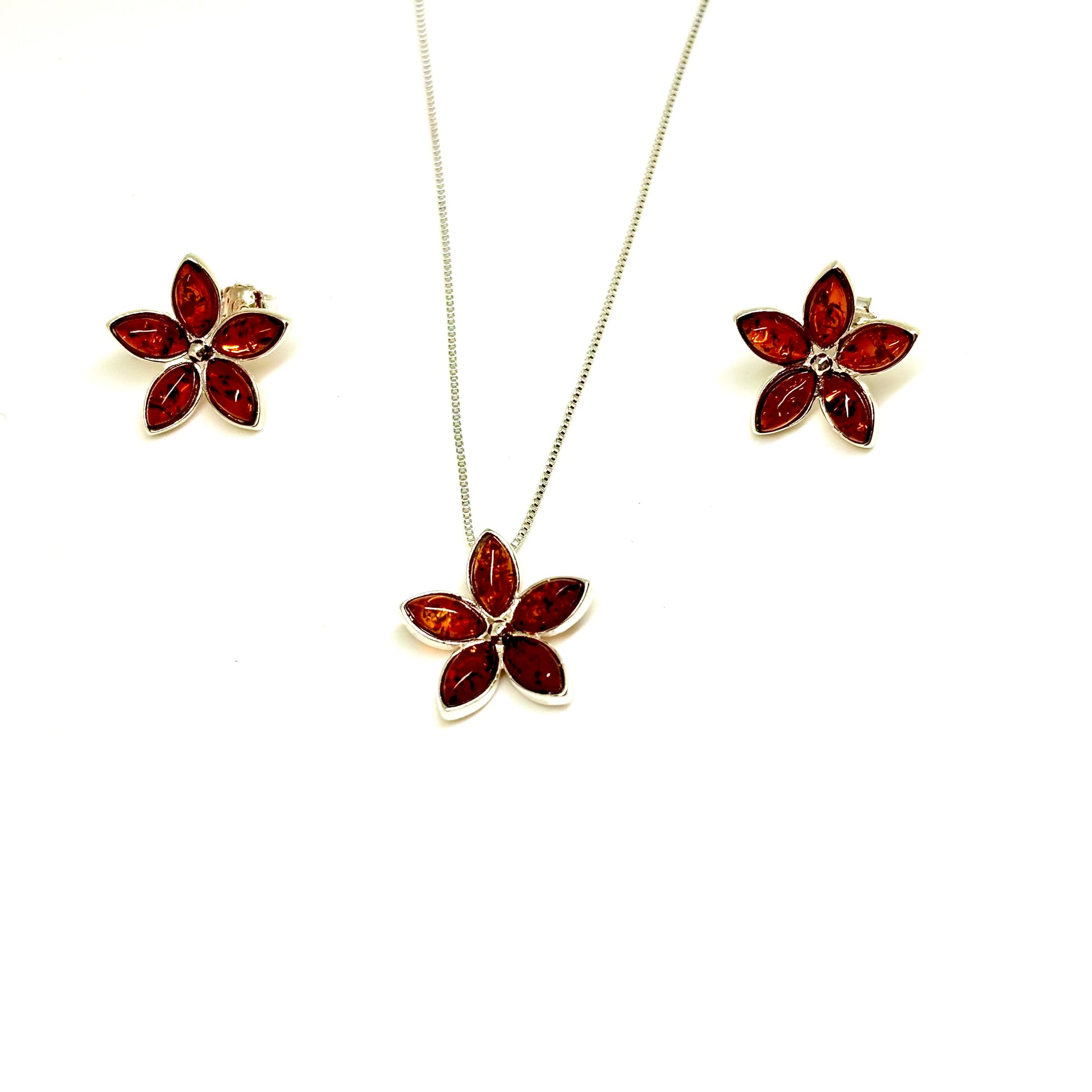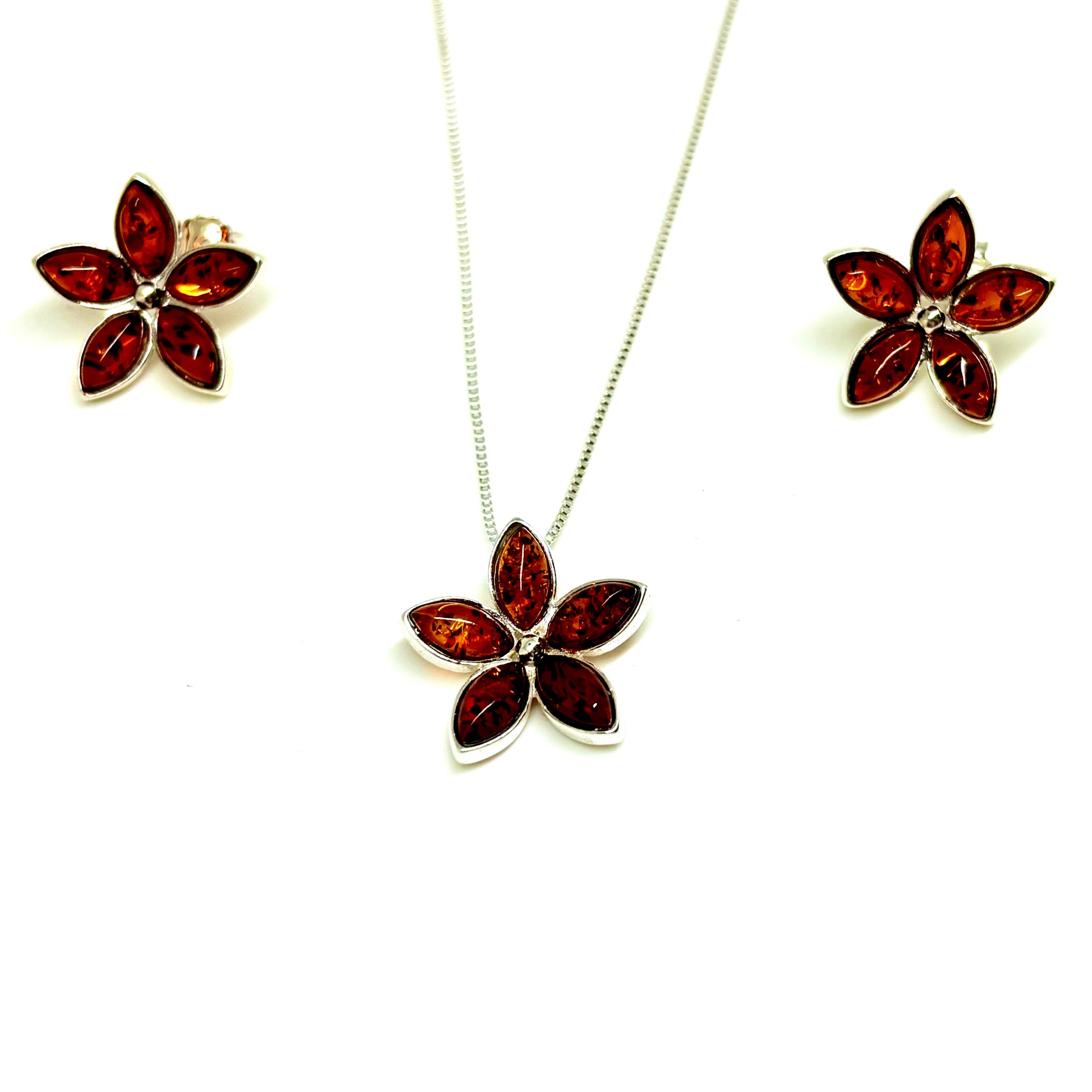 Cognac Color Baltic Amber Flower Pendant Necklace and Earrings Set