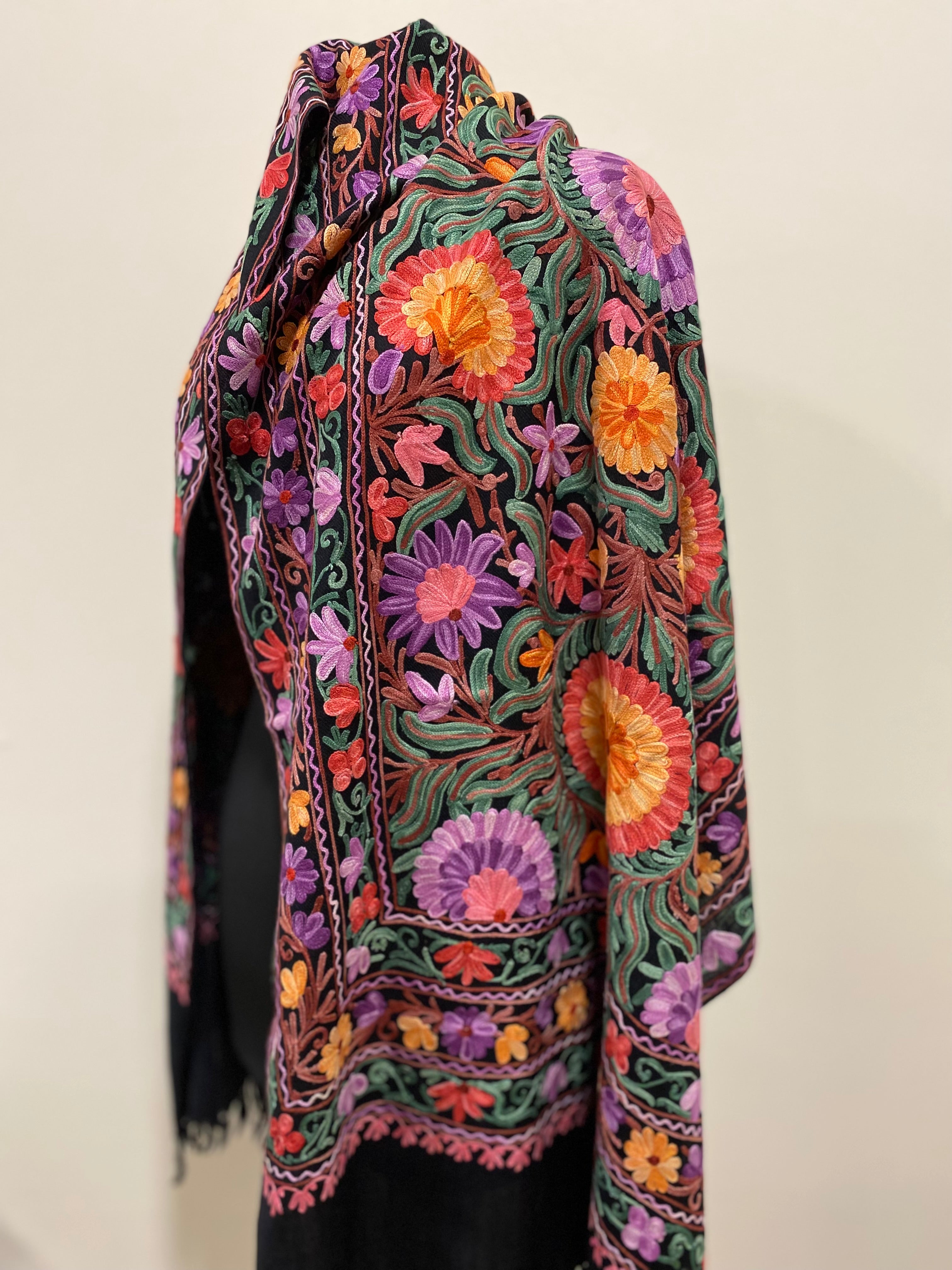 Shawl - Black Color Woolen Shawl with multi-color Aari embroidery