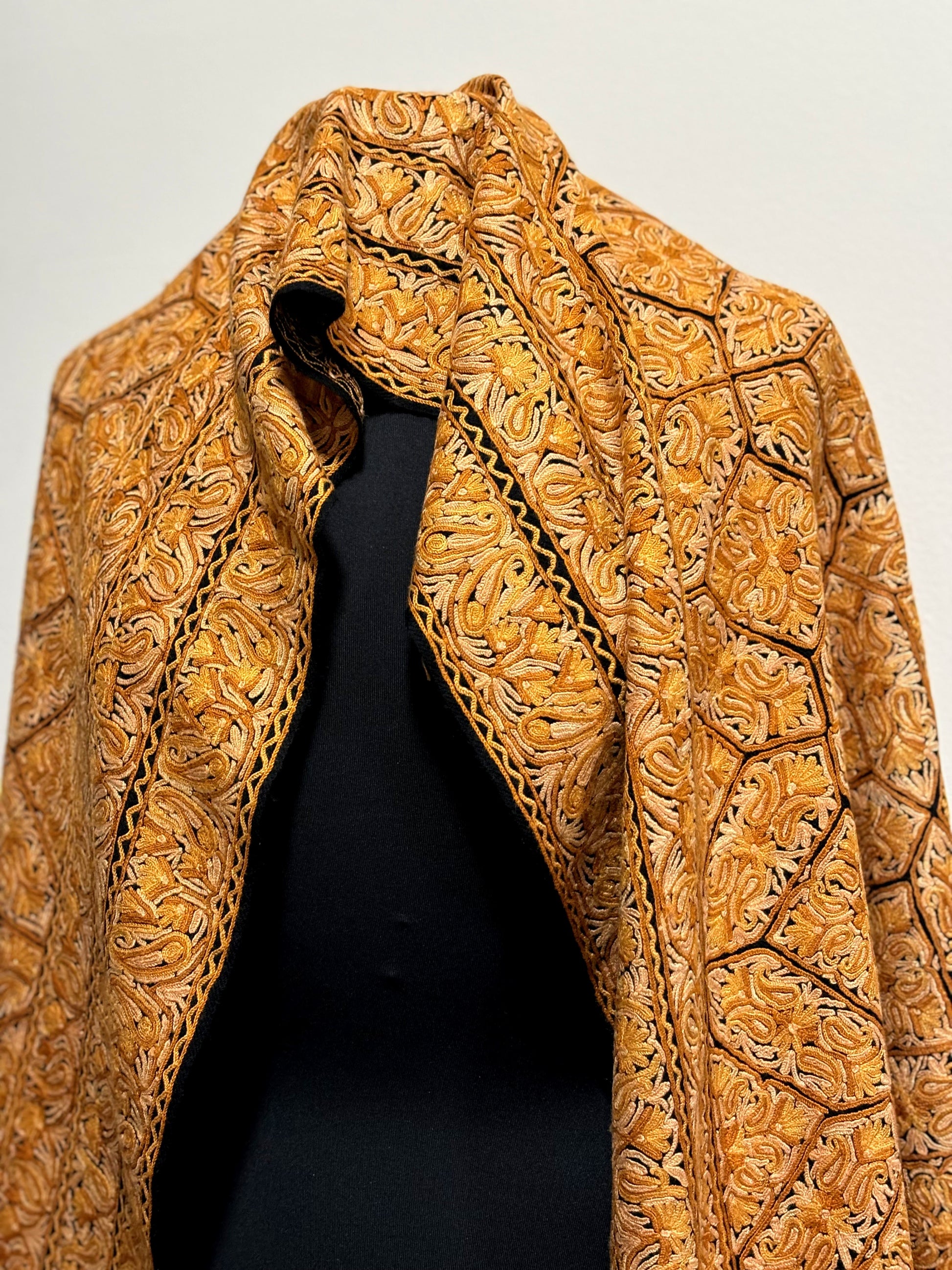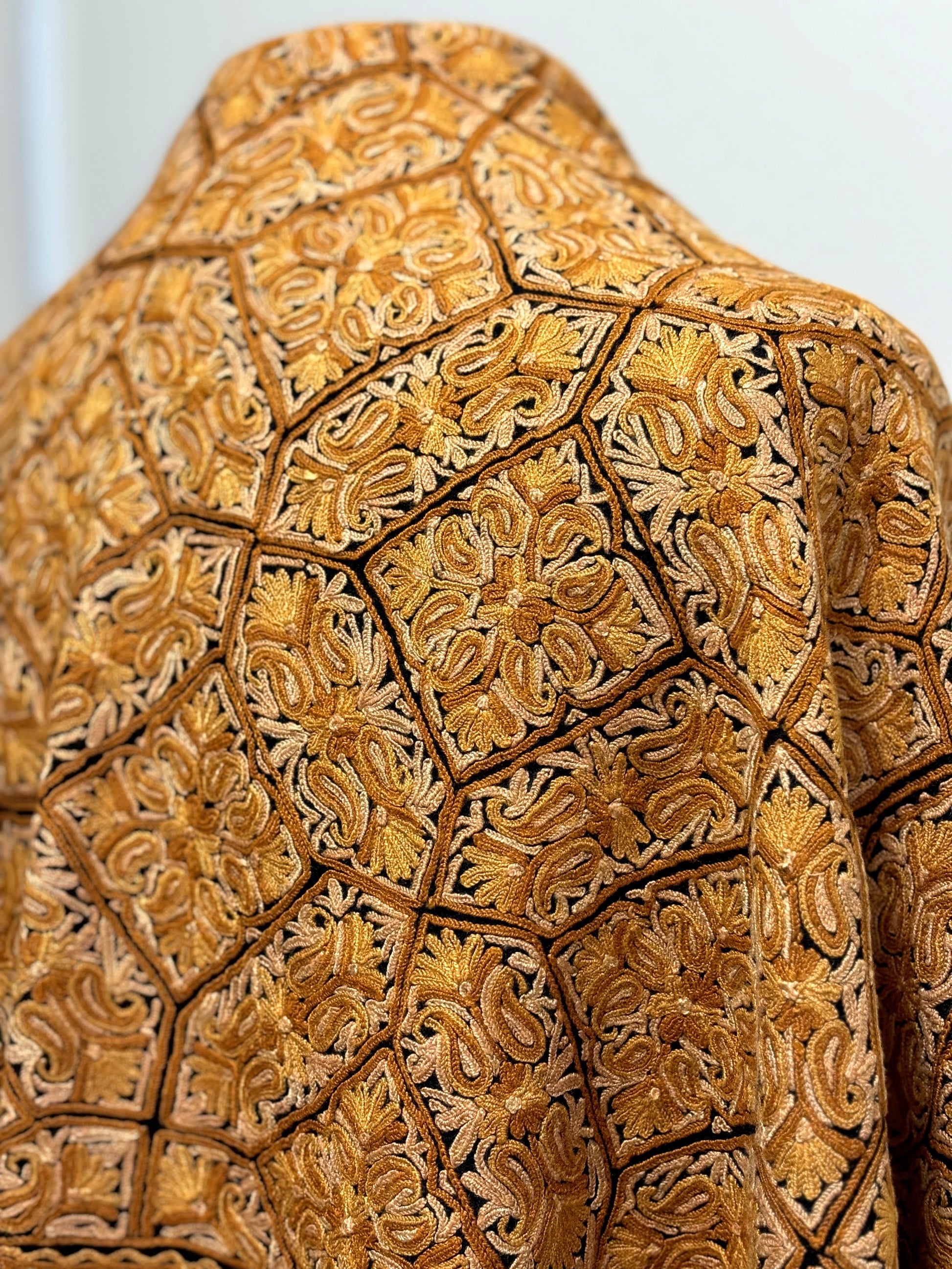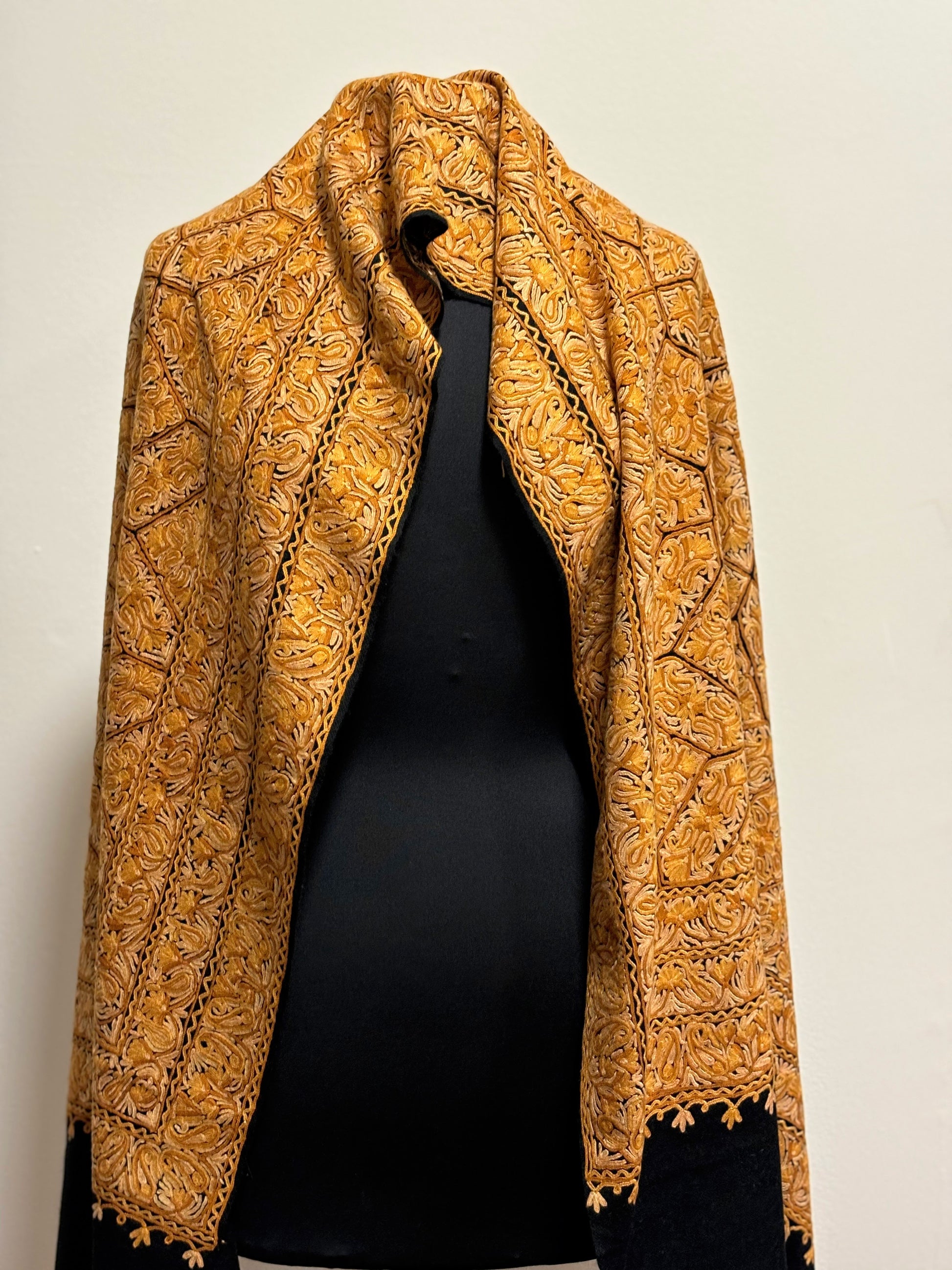 Shawl- Black color Woolen shawl with Yellow Aari embroidery